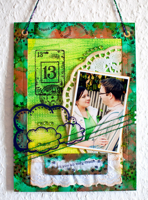 . . . der Designteam-Werke fuer den aktuellen Scrapbook-King Newsletter. Dieses mal bekamen wir ja die tollen Papierchen von Nat zum “spielen” und ich finde, die laden einfach dazu ein, auch selbst etwas herumzuexperimentieren und zu “schmaddern” . . .! Hier habe ich jeweils Adirondac Alcohol Inks auf dem Objekttraeger aus Glas benutzt und diese anschließend bestempelt und bei dem Wandaenger bildet das Grundgeruest ein 13 x 18 cm Karton-Passpartout von einem Foto-Leporello, der sich wegen seiner beschichteten Oberflaeche auch ausgezeichnet fuer die Alcohol Inks geeignet hat 🙂