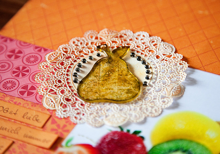 Die Birne ist ein transparenter Acryl-Charm-total genial-ich habe sie von der Rueckseite mit Stickles und etwas Alcohol Ink eingefaerbt, damit sie sich besser vom Hintergrund abhebt . . .