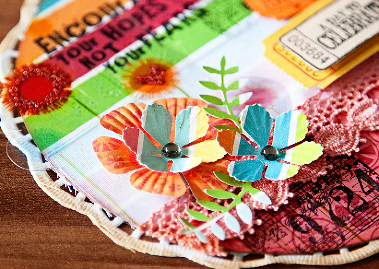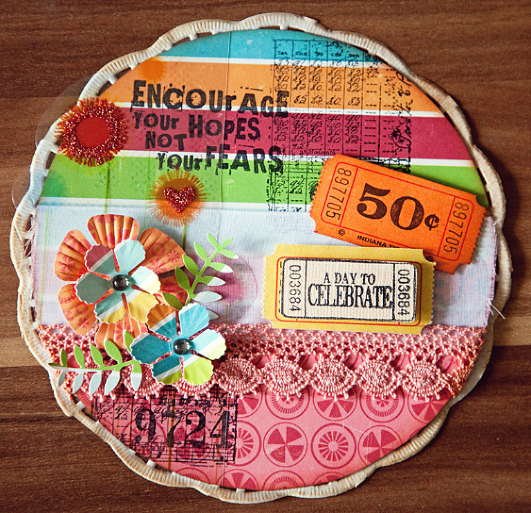 Zusaetzlich: Paper Doily; Tim Holtz Stempel; Haekelband; Dewdrops; Tickets