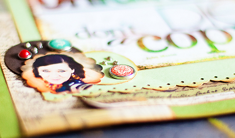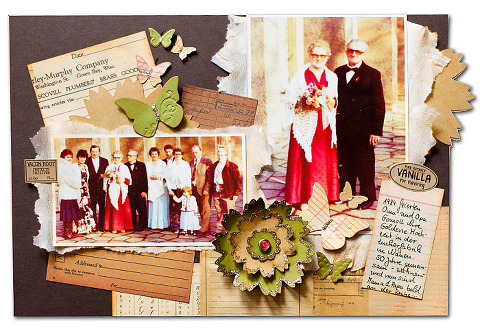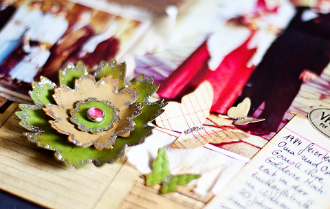 Papier & Sticker: 7 Gypsies “Camden”, Cardstock & Motivstanzer: Stampin’ Up!; Blumen: Prima Marketing; Brads: MME “Stella Rose”