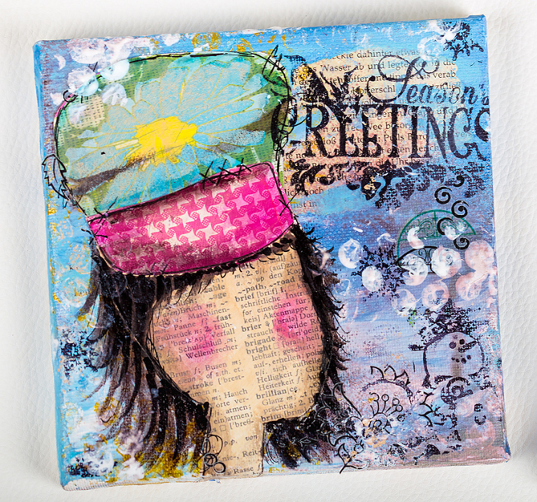 I had so much fun creating the Frosty the Snowman Canvas-I had to do more right away . . . again- SheArt-Style-love the simplicity of it and at the same time you can completely get lost in small details in pattern, texture & shading . . . lovin’ it 🙂 Plus: using up all those old RubOns I hoarded over the years, because here it does not matter if they’re not perfectly sticky anymore 🙂