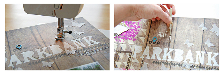Mit der Naehmaschine bringe ich noch etwas Struktur auf´s Layout.