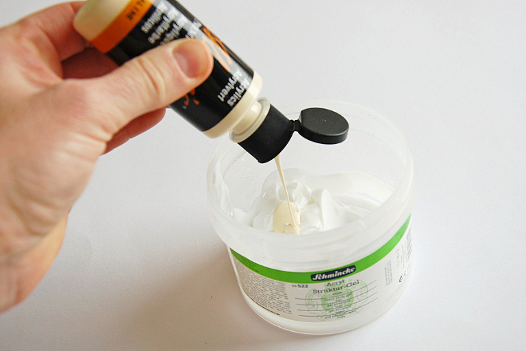 Das Acryl-Strukturgel mische ich mit etwas Acrylfarbe meiner Wahl. Vorsicht, das Gemisch darf nicht zu duennfluessig werden!