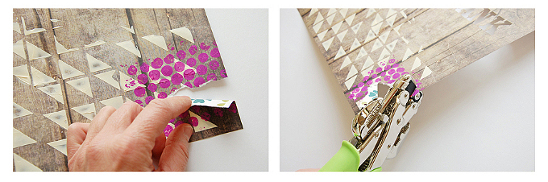 Nach dem Trocknen der Farbe reiße ich das Papier etwas ein, klappe es um und fixiere die Ecken mit Eyelets.