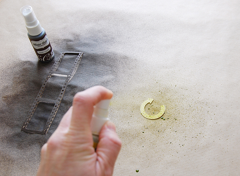 Die mit der Silhouette Cameo ausgeschnittenen Teile faerbe ich mit Spruehfarbe ein.
